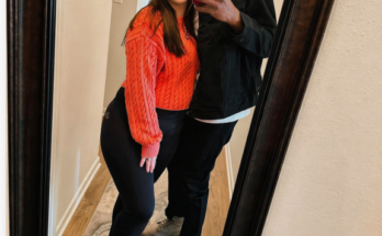 This photo captures a beautiful, genuine moment between two people who clearly share a strong connection. Standing together in a cozy hallway, the couple leans into each other naturally, …